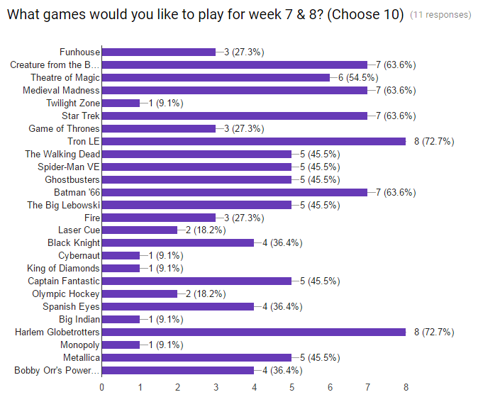 Well the votes have been tallied and it looks like we have some results. Week 7 we will play Tron LE, Harlem Globetrotters, Creature from the Black Lagoon, Star Trek Premium, and Batman ’66.