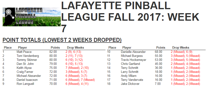 Well here we come approaching the last week of the season and the championship is still up for grabs! We had a relatively small turnout last night due to some work, vacation, and health issues making their way through our league but fun was still had by those in attendance. Below are the standings.