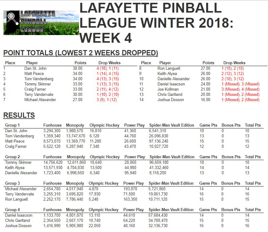 Dan finally had a week where he wasn’t at the top of the heap, yet he remains with a commanding 4 point lead in the overall standings. All groups had competitive play this week, and we had a new member who will be joining regularly from Michigan in Josh Dosson. Full recap and results are below.