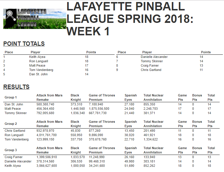 The next league night is 4/24/2018 at 7:30 PM downtown at Main Street Amusements, the games that week are out of this world. Avatar, Big Bang Bar, Firepower, Magnotron, Star Trek.