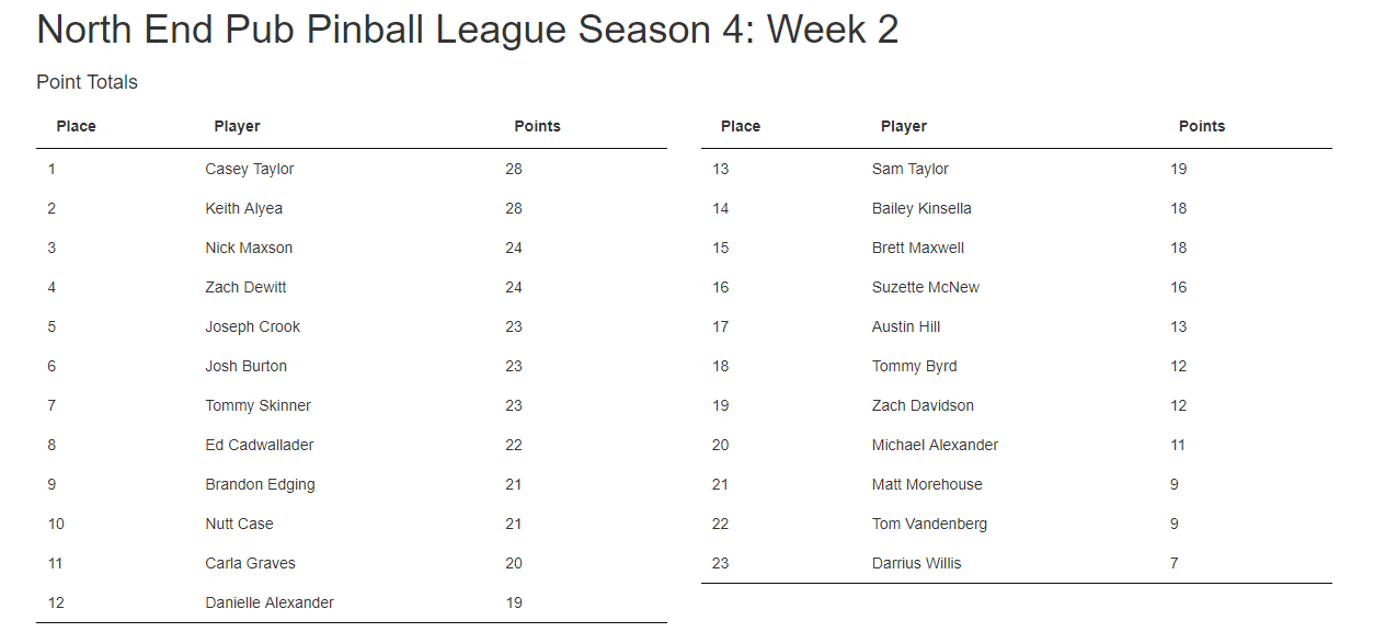 Thanks to everyone who showed up last night and had a good time! Remember if you missed last night you can always come down the following Monday to get your makeup scores in! Here are the updated point totals before Make-Up Monday scores get added in as well. Another great turnout and another new player! Let’s keep that going!