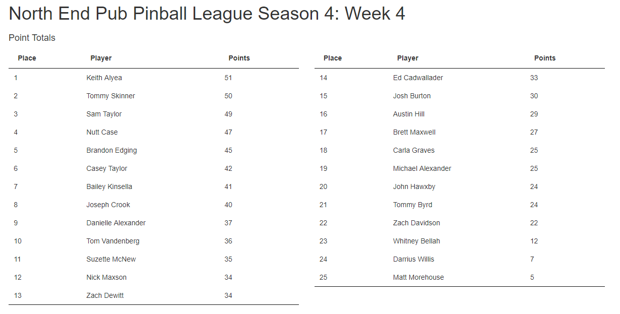 Here are the current North End Pub Pinball League standings before the Make-Up Monday scores are added in tonight.