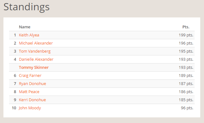 North End Pub standings, finals will be Sunday, November 4th @ approximately 4pm. Top 8 make the finals.