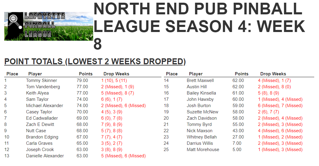 The finals are Thursday at 8 PM! We will be playing a 4 strikes format, everyone is welcome to participate in the finals event. I hope to see all of you there, and thank you for a great turnout this year.