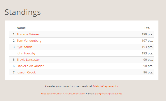 First Place is Pindemonium Zwei with three wins and 21 total points. Second place are the Region Rats with 2 wins and 16 points, and trailing just behind them is RIP Tommy B also with 2 wins, but only 15 team points. Currently in fourth are the reigning champions Super Jackpots with 1 win and 13 points, closely followed by The Doom Room who hold a head to head victory over the Super Jackpots but only have 11 points to currently go with their 1 win. Coming up in the rear are the Pull & Pray team currently with no wins and 5 points on the season. We have two games left for each team.