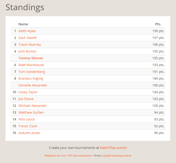 Here are the final standings for the March Selfie Tournament! The top 8 players are invited to play in the finals tonight at 6 PM, it is 4 strikes format, 2 strikes given out per group. The tournament should last roughly 2-2.5 hours. Hope to see several of you there.