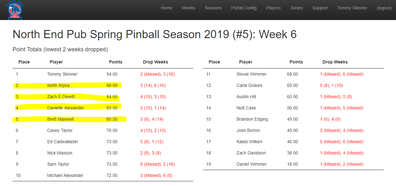If your name is highlighted (Keith, Zach DeWitt, Danielle, and Brett) you are currently qualified to play in the HOPS League Championships! This takes place Saturday, May 4th in Indianapolis at Boss Battle Games! The event should last roughly from 1PM-6PM, and include the top 16 players from around the state duking it out for pinball supremacy!