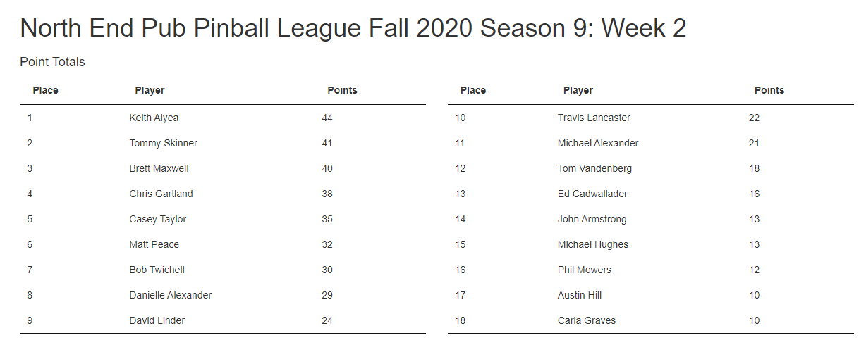 Thanks again for another awesome week of league, I really appreciate everyone coming out and playing, great to see people again! I hope everyone is enjoying themselves, and if you need anything or have any suggestions please let me know. Here are the current standings after week 2.