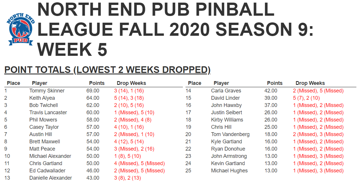 Hey everyone, I just wanted to start off by saying thank you so much for coming out and playing in league at North End Pub. It has been such a pleasure to see everyone, and I also appreciate everyone’s efforts to mask up and stay safe while there! This past week was the busiest the machines have been since last February and we really appreciate that. We really hope you are enjoying the new games and that everyone feels welcome at league and has a good time.