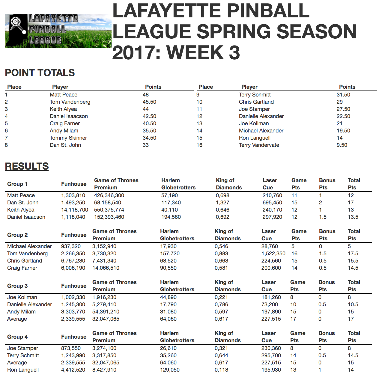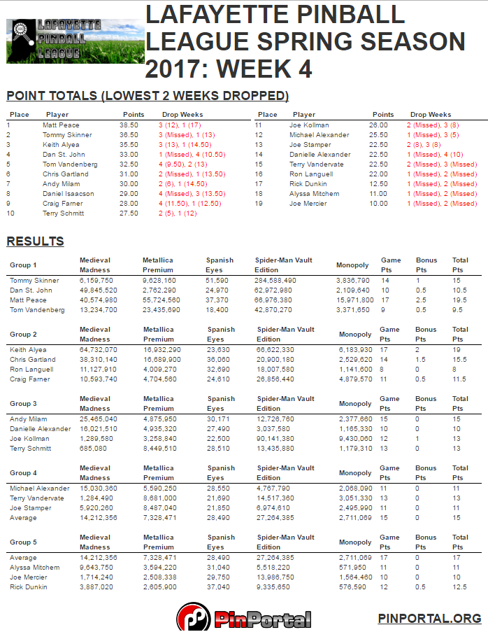 Secondly congrats to Travis Kearney on winning the February Selfie Tournament last night! The battle was closely contested as it came down to all players having 3 strikes heading into the last couple of games. Travis finished at the top, Casey Taylor in 2nd, Tom Vandenberg in 3rd, and Michael Alexander in 4th. Thanks to all 17 players who put up scores for the month of February. Look to play Split Second and World Cup Soccer for March! Both games are still having some gremlins sorted out but are playable currently and will only get better throughout the month. You can now post your scores to Matchplay, you can write them down on the official score sheets that are attached to the games with magnetic clipboards, or you can just text them to me 574-596-2668. You have until the end of March to get those scores in. Below are the current standings for March.