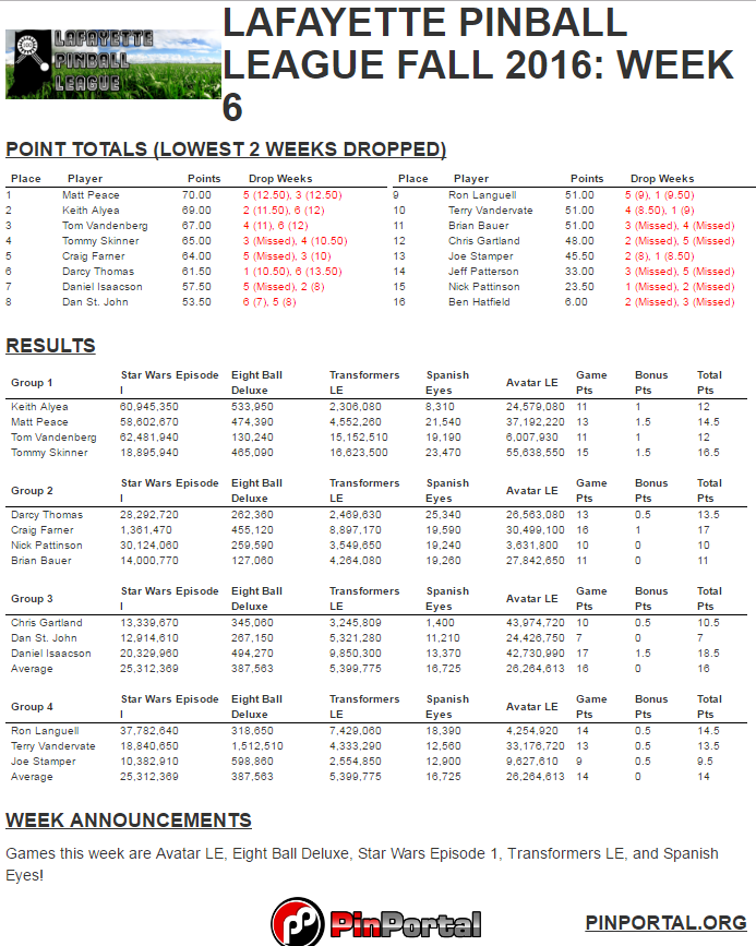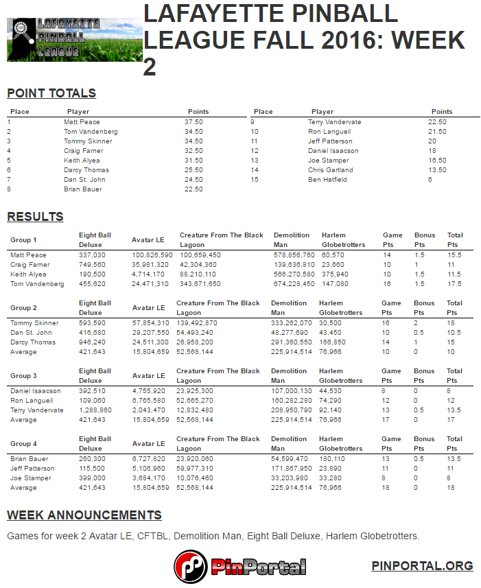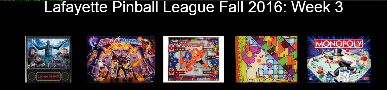 Third, we start our new individual season on Thursday night at 8:30 PM. We will still be using pinballportal.com to enter our scores each night. The season will last 8 weeks, and your two lowest weeks will be dropped from the standings for your season total. The top finishers from the season will get to compete in the Hoosier Open Pinball Super-League Finals event at a date and time to be determined. They will face off against the top players from other leagues located around the state to determine an overall champion.