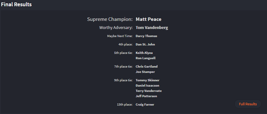 First off, congrats to the Region Rats on an epic victory in Team League 2019! They rose up from their second place regular season placement to win the championship by 1 point over Pindemonium Zwei! with the final game being decided on Stars! THE CUP will soon be emblazoned with their team name an individual members names as well. Thank you to everyone who came out and played in Team League. The time is now to start prepping for 2020! Get your teams ready!
