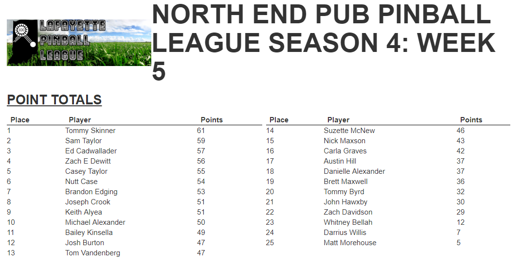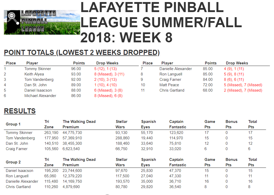 Here are your final standings for the Lafayette Pinball Summer/Fall League Season! Our finals event will be in two weeks. My suggestion is that we alter the format from tradition and simply make it a group strikes tournament to increase its value, I will send out a survey soon.