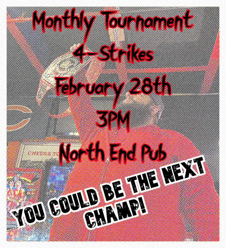 Just wanted to again give a huge thank you to everyone who came out and played in the tournament at North End Pub yesterday. That was the most people we have had for a tournament in awhile and I really appreciate everyone taking the time to travel and spend the day flipping the games down there. I hope everyone had a good time and will be back for our next tournament on March 28th! There were a ton of really close games yesterday and I hope everyone got to try out some new machines they hadn’t seen before. Here are the final standings from yesterday.