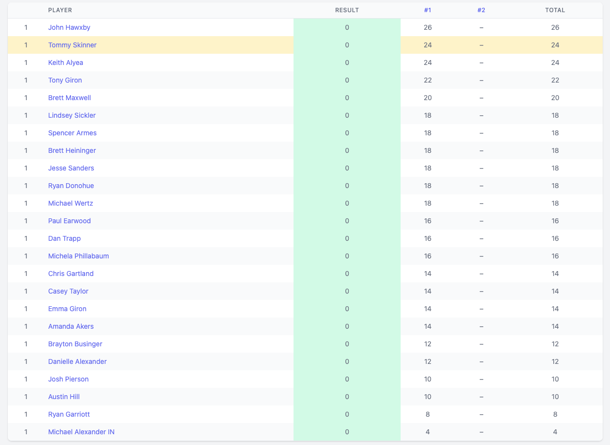 PLAYER | RESULT | #1 | #2 | TOTAL | |