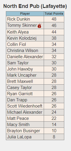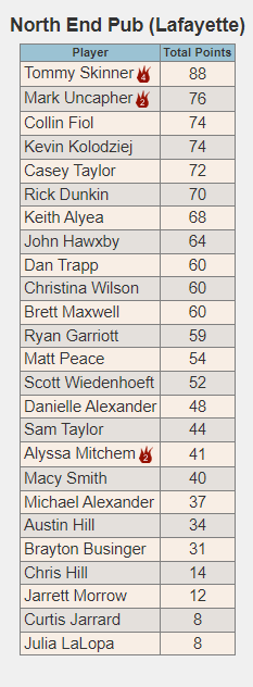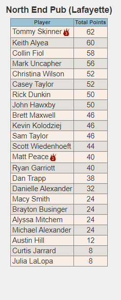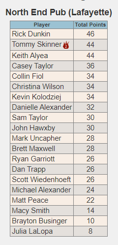 Thank you so much to everyone who has been coming out and playing with us this season! I hope you are all enjoying it as much as I am! We still have one set of makeup scores that will get entered before we start tonight but here are the rough standings as of right now.